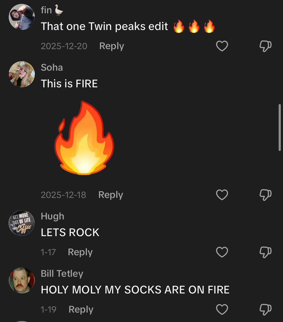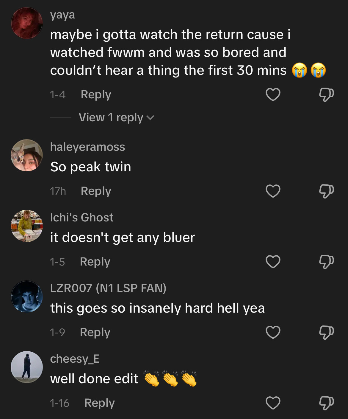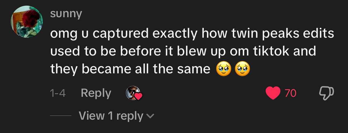With the next edit, "The Beauty of Twin Peaks," I was following another trend surrounding the song "Every Living Breathing Moment," a grand orchestral track by Grant Seller that fans of various media would make dramatic edits to to demonstrate the beauty of their favorite media. The video, while underperforming comparatively to some of my other Tiktoks, only getting about 18k likes and 73k views, resonated immensely with the audience that did end up seeing it, with many calling the "best twin peaks edit I've ever seen" or that it was a "masterpiece." Jen Lynch herself recently called it "Truly beautiful."