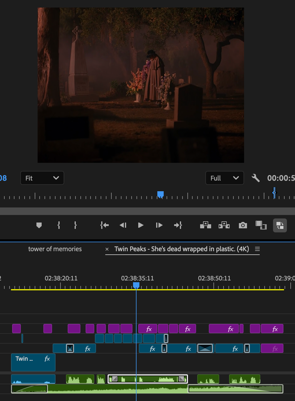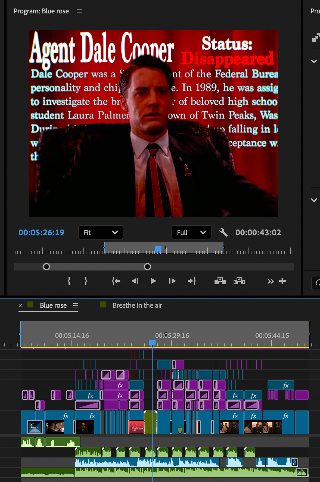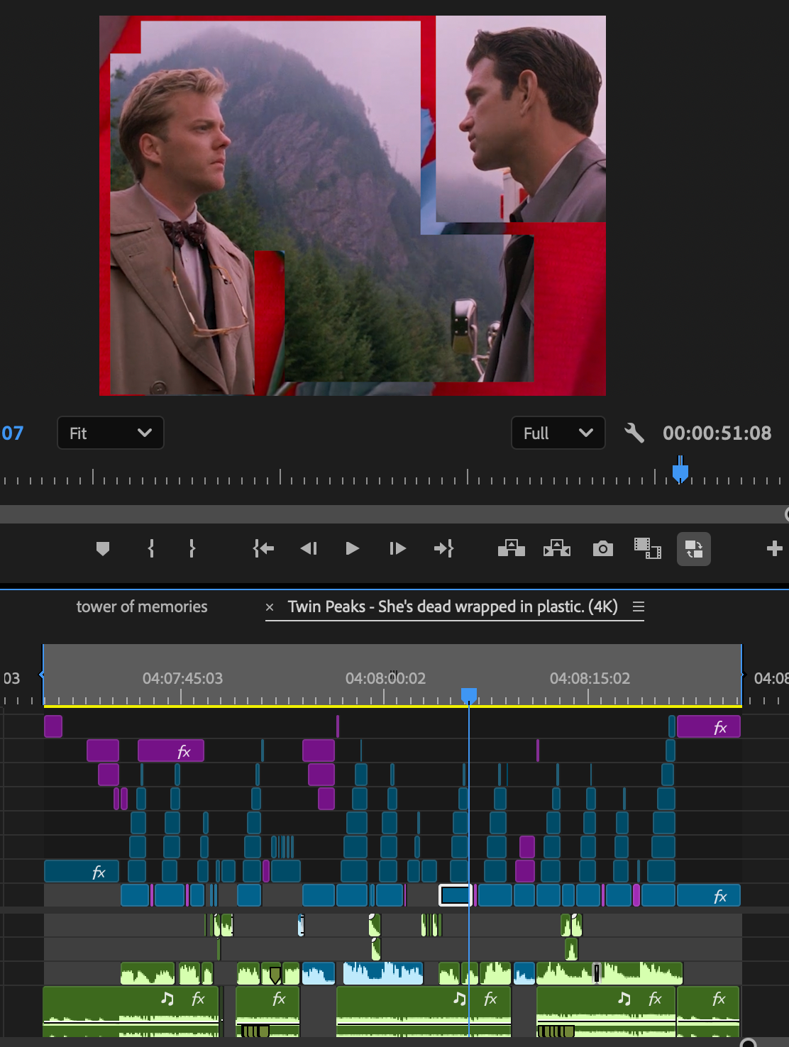 The edit, while just a simple compilation, required me to sift through hours of footage, looking for my favorite shots and moments from the show, organize them based on which part of the show they came from through color-coding, and matching them to the tempo of the surrounding clips as well as the rhythm of the song. The edit also included iconic dialogue from the show with accompanying subtitles. The edit captures the entire picture of Twin Peaks and presents it in the longest edit I crafted for this page, clocking in at 1 minute 41 seconds. The edit can be found here.