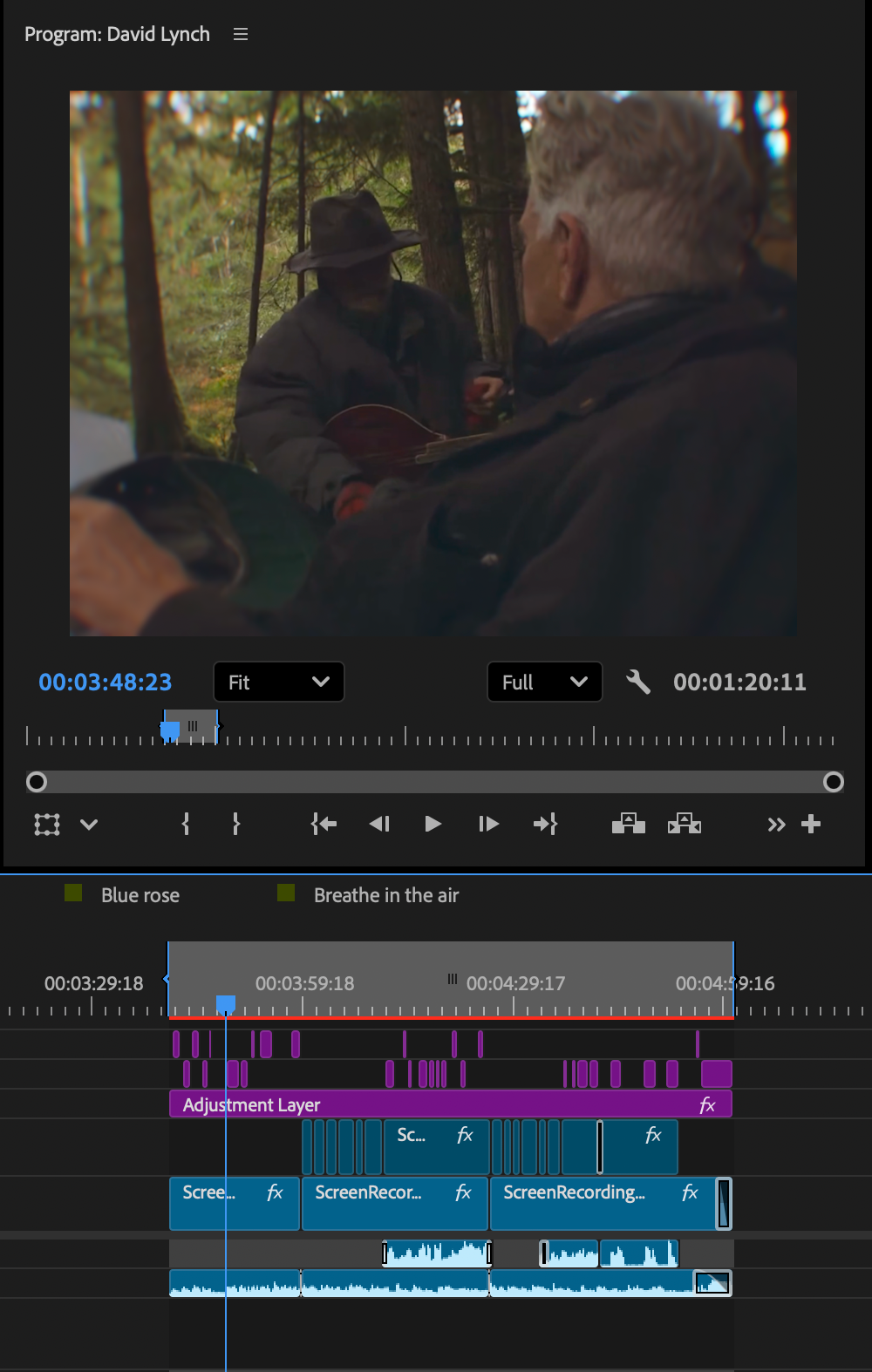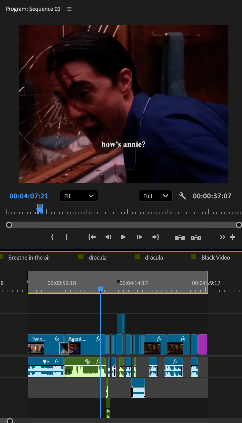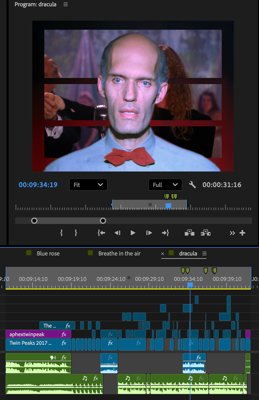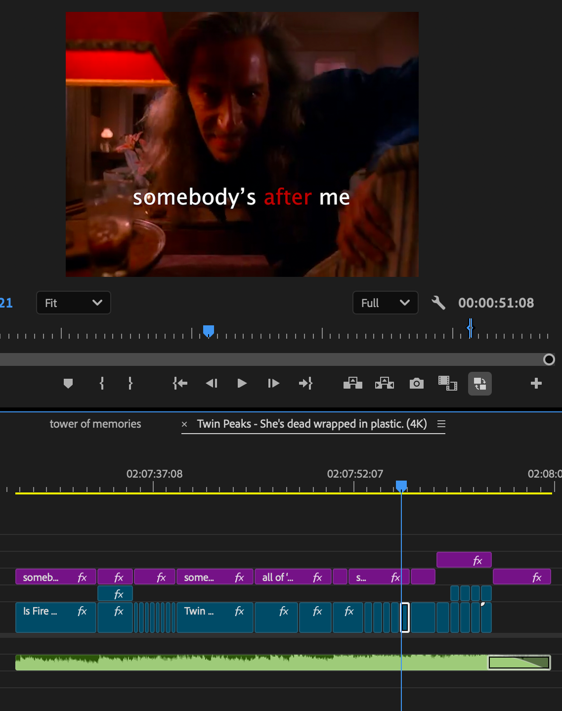 The edit, while just a simple compilation, required me to sift through hours of footage, looking for my favorite shots and moments from the show, organize them based on which part of the show they came from through color-coding, and matching them to the tempo of the surrounding clips as well as the rhythm of the song. The edit also included iconic dialogue from the show with accompanying subtitles. The edit captures the entire picture of Twin Peaks and presents it in the longest edit I crafted for this page, clocking in at 1 minute 41 seconds. The edit can be found here.