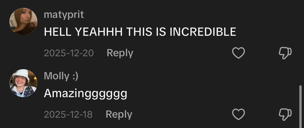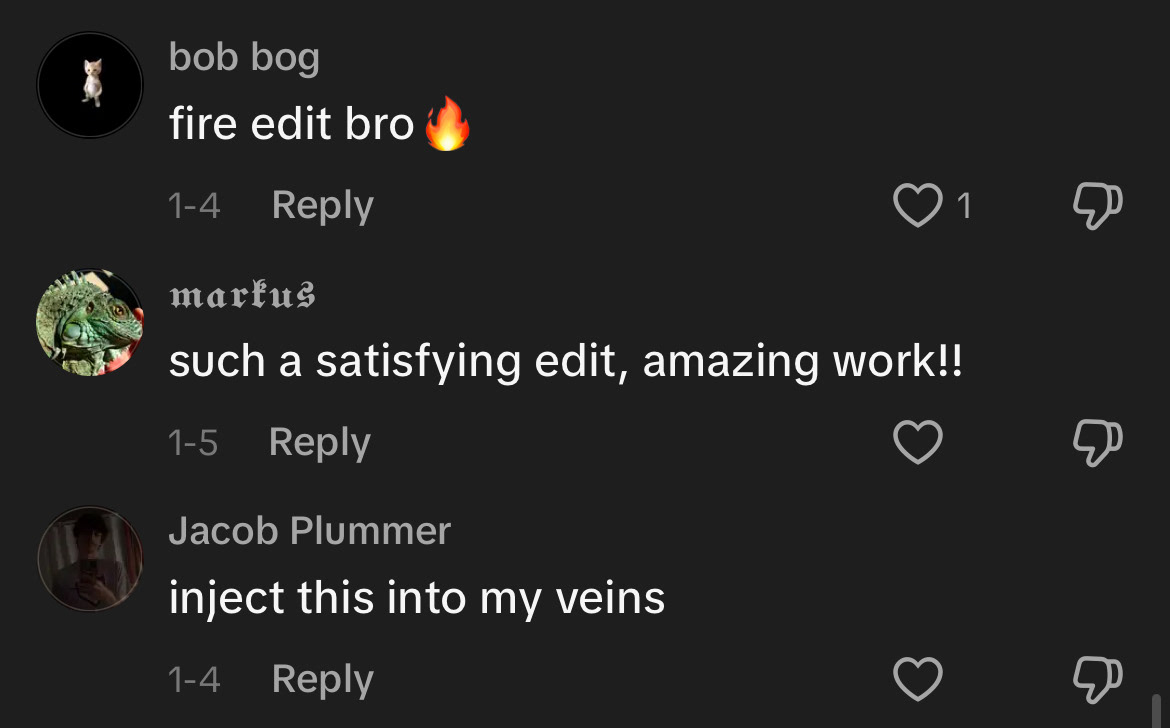 This edit was one of the biggest jumps in skill that I had in terms of pacing as well as visual language. I finally began to master masking, which allowed my edits to become deeply layered. The edit is to the Tame Impala song Dracula, and it follows the flow and vibe of this upbeat song. While the edit itself didn't exactly blow up, with only around 5k likes and 28k views, it got a lot of positive reactions in the comments (see images). The edit can be found here.